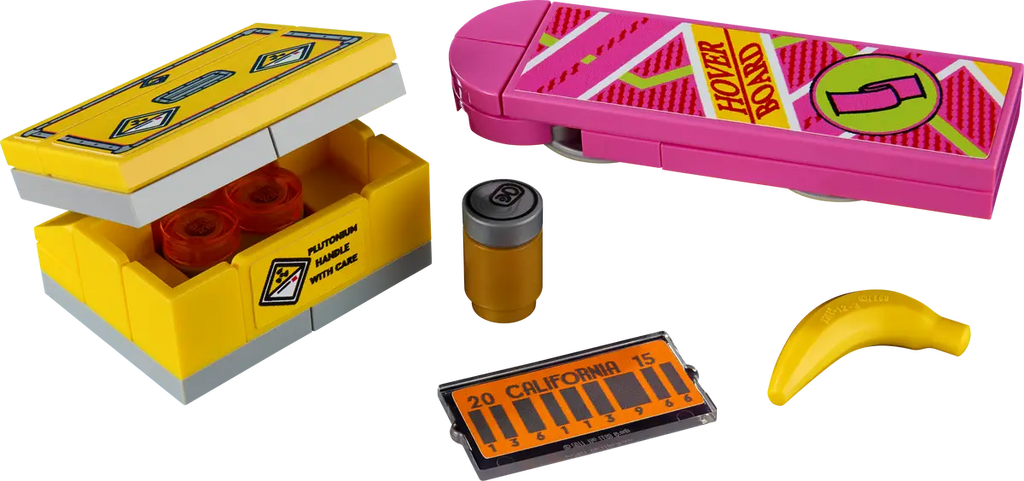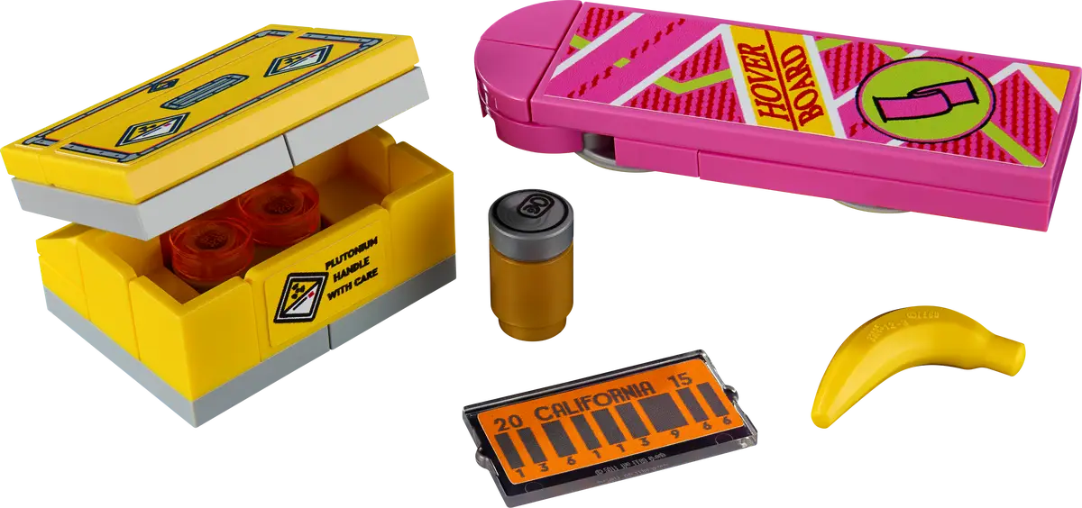 - The LEGO DeLorean also features Doc and Marty McFly LEGO minifigures and fun accessories like a hoverboard, banana and a soda can